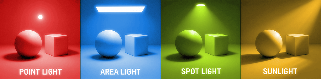 Another essential light type is the Spot light, which focuses light in a specific direction and creates a cone-shaped beam. (A Spot light is that dramatic friend who enters every room like it’s a stage—and honestly, sometimes your scene needs that energy.) This feature is useful for emphasizing particular areas of a scene or creating dramatic effects. Finally, the Area light emits light from a defined surface area, allowing for soft, diffused shadows. (Area lights are like therapists—calm, soft, and they help everything around them feel a little more balanced.) It is widely used in interior scene lighting, providing depth and realism by mimicking natural light sources such as windows.